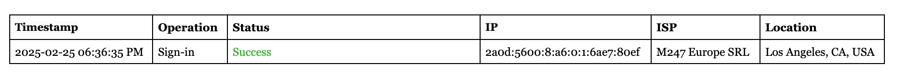 Microsoft published the first sign-in related to this attack about 6 minutes after it happened. At first, we didn’t see any of the failed sign-ins, and only saw the single successful sign-in: