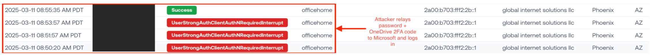 Not even a minute after the user receives their OneDrive 2FA code, we see suspicious logins from global internet solutions llc, a datacenter seen in many AitM attacks.