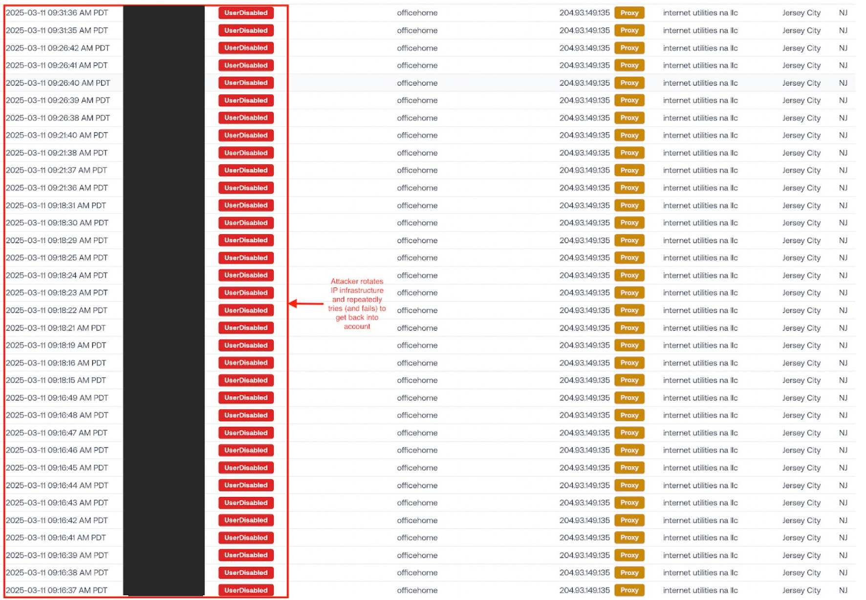 After being promptly kicked out, the attacker switches over to a new proxy IP to evade further detection. They repeatedly try (and fail) to log in with their session.