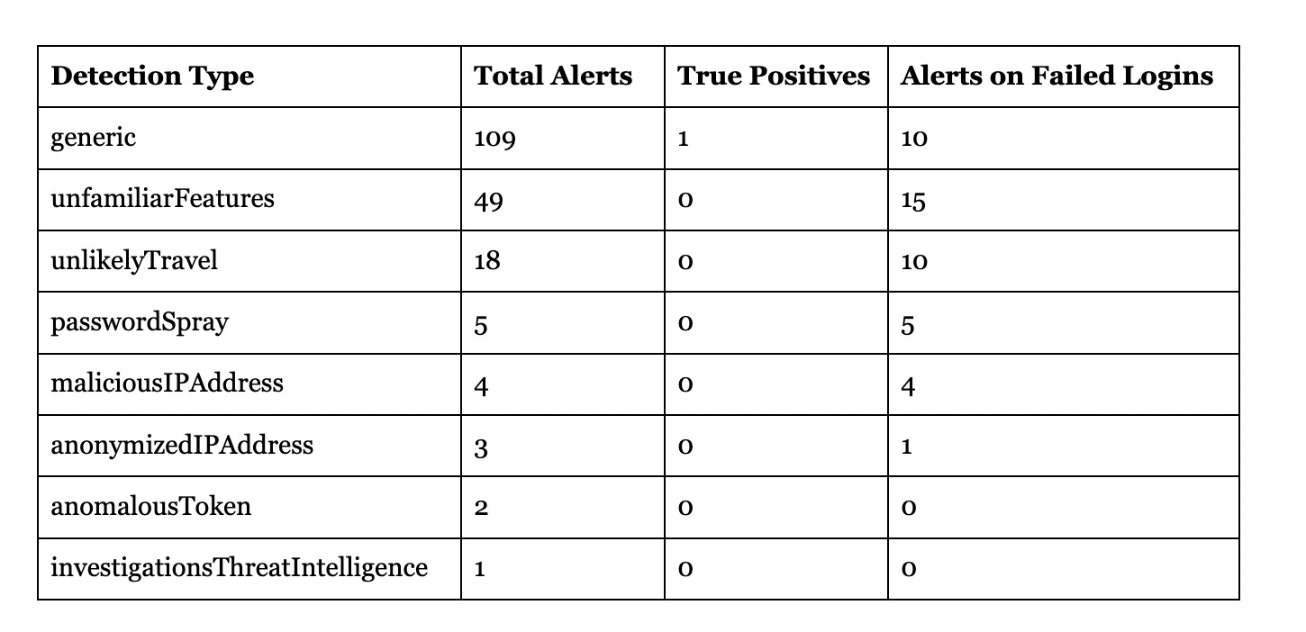 Take the passwordSpray detection – all 5 alerts were for failed logins. Because they were failed, they posed no actual risk.